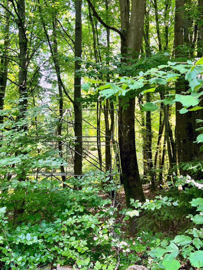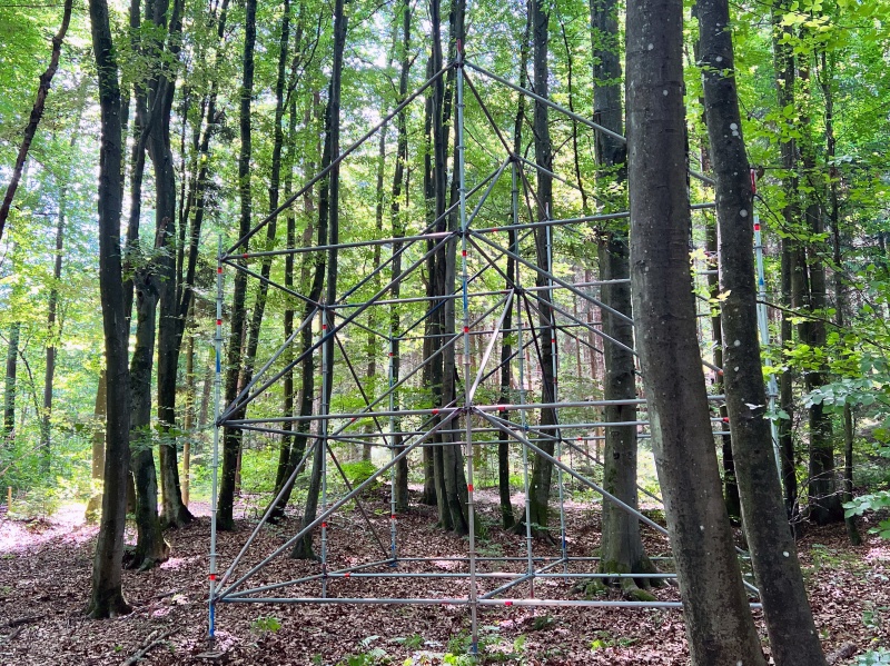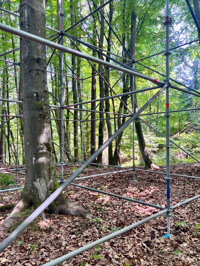 eine Installation aus Gerüststangen im Wald